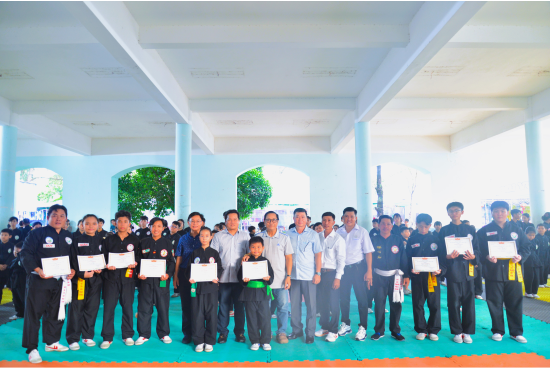 Nhân dịp này, Liên đoàn Võ thuật tỉnh đã trao giấy khen cho 01 huấn luyện viên và 08 võ sinh của Câu lạc bộ võ Cổ truyền vì đã đạt thành tích xuất sắc tại Liên hoan Võ Cổ truyền TP. Hồ Chí Minh mở rộng lần thứ VII diễn ra từ ngày 25 đến 30/7/2025. Kết thúc kỳ thi, Ban Tổ chức cũng đã tặng 10 giấy khen cho những võ sinh có điểm số cao nhất. Song song với đó, Câu lạc bộ Võ Karate cũng tổ chức kỳ thi nâng cấp đai. Các võ sinh đã lần lượt thể hiện kỹ thuật quyền, đối luyện, thi đấu đối kháng… đúng với nội dung, yêu cầu của từng cấp bậc. Kết thúc kỳ thi, Ban Tổ chức đã tặng giấy khen của Chủ tịch Liên đoàn Võ thuật tỉnh cho 03 võ sinh có thành tích xuất sắc nhất.